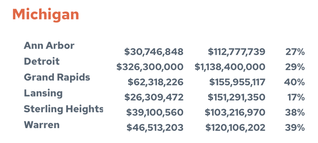 The data on the Action Center on Race & The Economy also shows that Grand Rapids has the highest percent of their budget going to policing, compared to other urban communities in Michigan. If you go back to the link https://costofpolice.org/, then click the View All button, you can see the breakdown of police funding in states across the country. Here is the breakdown for Michigan, which shows that Grand Rapids is slightly higher than Sterling Heights and Warren, but 11% higher than Detroit.