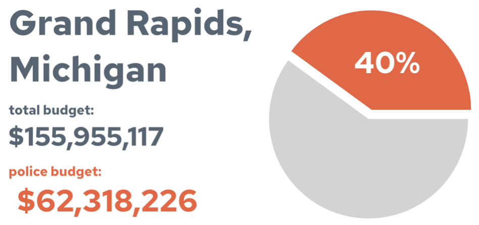 If you go to this link https://costofpolice.org/, you can write in Grand Rapids, where it says Enter a City. You read that the 2023 Grand Rapids City Budget comes to $155,955,117, with a police budget of $62,318,226. This means that 40% of the City’s budget is going towards policing.