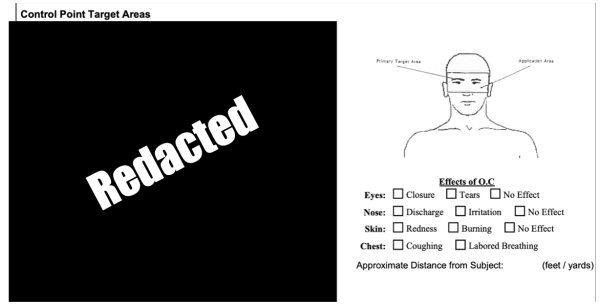 The third FOIA document is exclusively about the “use of force”, which has 99% of the information redacted. The information redacted includes the number of “use of force applications”, the “effectiveness of force”, injuries incurred by “the subject”, the control point target areas, and the officer’s narrative, all of which are redacted.