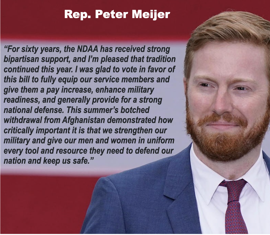 Last week, 3rd Congressional Representative, Peter Meijer, voted to for the National Defense Authorization Act (NDAA) for Fiscal Year 2022, which passed the House by a vote of 363-70.