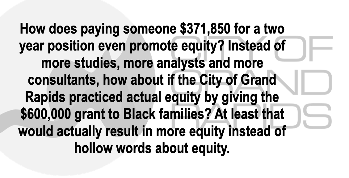 Is all of what was just mentioned going to be the focus of the new Equity Analyst? Does paying someone $371,850 for a two year position even promote equity? Instead of more studies, more analysts and more consultants, how about if the City of Grand Rapids practiced actual equity by giving the $600,000 grant to Black families? At least that would actually result in more equity, instead of hollow words about equity.