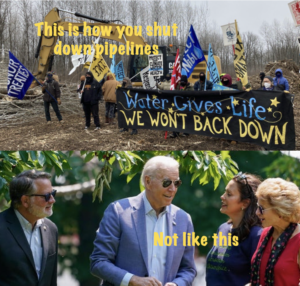 Therefore, we can reasonably conclude that we cannot and should not rely on the State of Michigan or the Biden Administration to shut down Line 5. In fact, what we should be doing is exactly what Indigenous communities are doing, which is to actively resist these tar sands pipelines. We need to learn from the Standing Rock resistance, we need to support and participate in the Line 3 resistance, https://www.stopline3.org/#intro and we need to be doing the same thing in Michigan to shut down Line 5. Relying on the government is a false hope. Direct Action is the solution!