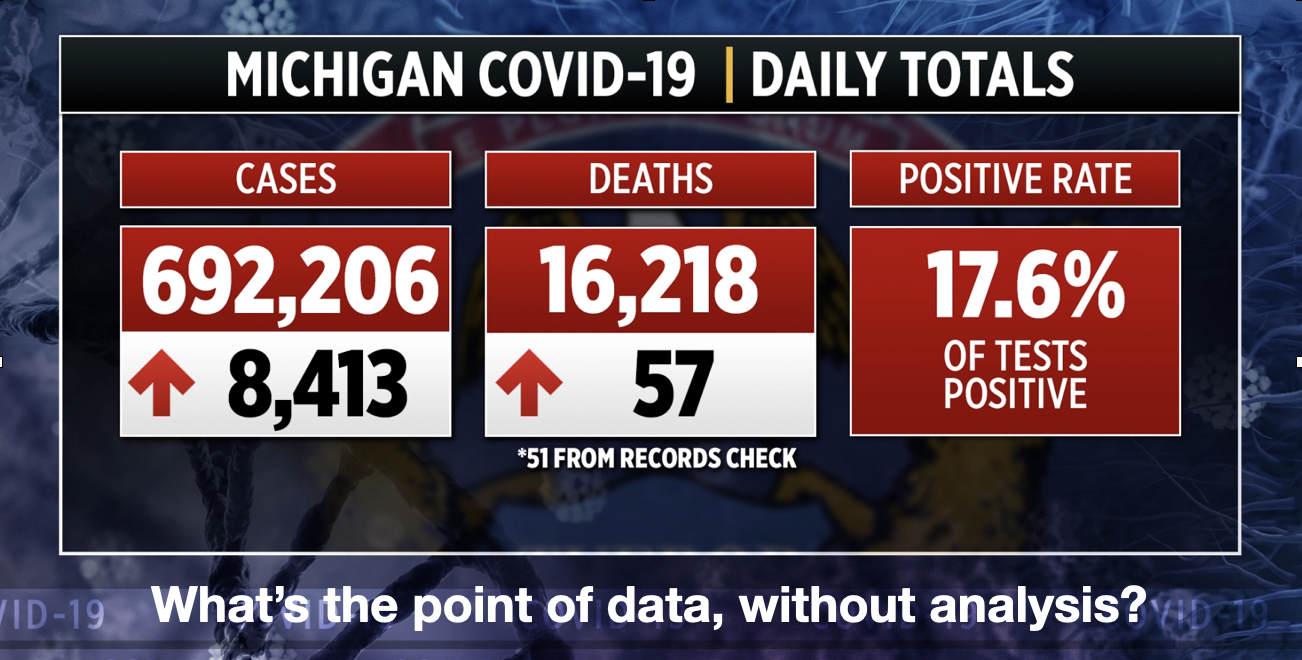 The story filled with data, both at the state level and data specific to West Michigan. Channel 8 focused on the rising number of people testing positive for COVID, the number of deaths in the last few days, along with maps and even more data.