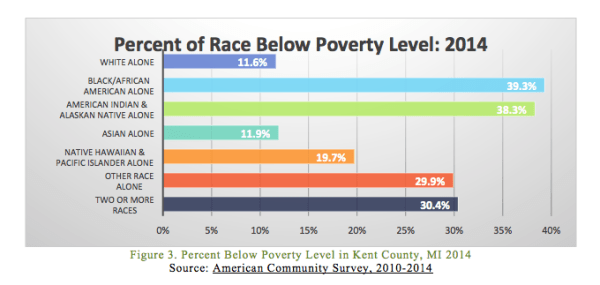 In addition, since the American Lung Association listed that poverty was another at risk category in terms of air quality, the graph below, once again, demonstrates that there is a disproportionate amount of African Americans, and communities of color in general, who are experiencing poverty. Another way to look at this is that roughly 80% of Kent County residents are White, yet communities of color account for roughly 88% of those living in poverty in Kent County, based on this graphic.
