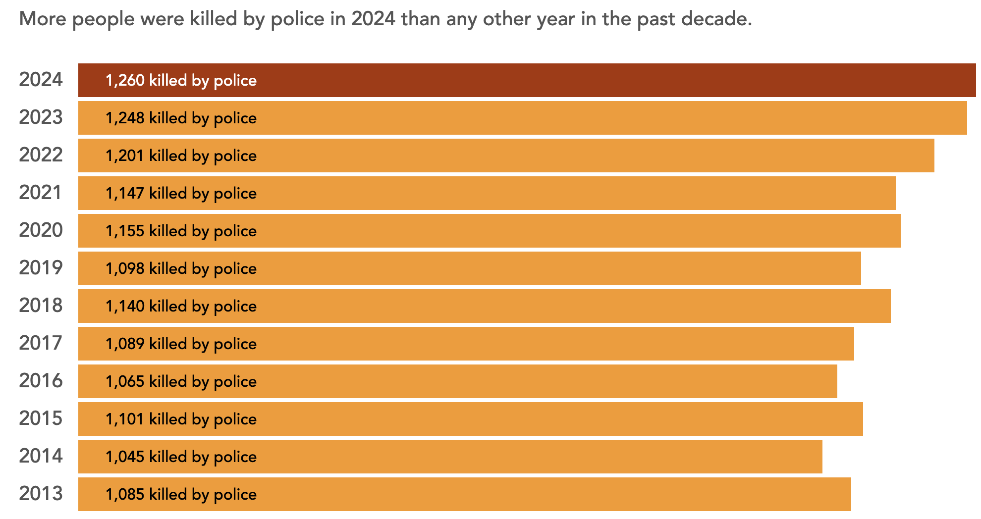 - 1260 people were killed by cops in 2024, which is the highest number in any given year since 2013.