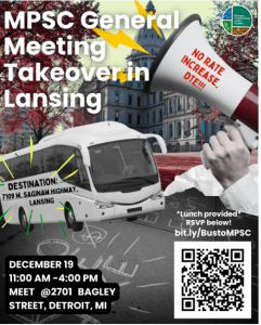 Another way to take action is by joining the Michigan Environmental Justice Coalition by heading to the Michigan Public Service Commission hearing on December 19th, 2024. MEJC staff and community members will be driving up together in one bus to attend the MPSC meeting, leave a comment and hand out energy democracy goodie bags! Please meet at the MEJC office, 2701 Bagley St, by 11:00am. We’ll head to Lansing and be at 7109 W. Saginaw Highway, Lansing, Michigan, 4891. We should be back at the office no later than 4:00pm. Lunch will be provided! You can register here.
