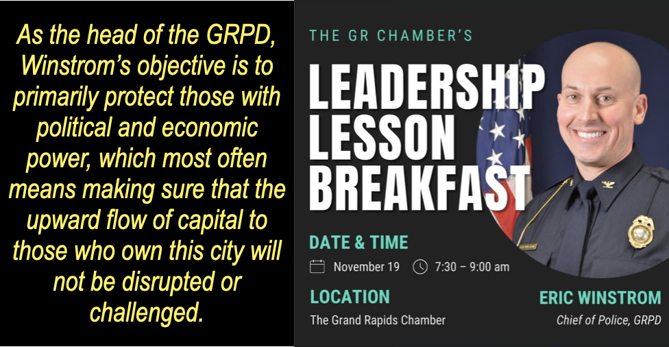 When it comes to GRPD Chief Eric Winstrom, the GR Chamber’s choice to have him speak is crystal clear. As the head of the GRPD, Winstrom’s objective – like all police departments – is to primarily protect those with political and economic power, which most often means making sure that the upward flow of capital to those who own this city will not be disrupted or challenged.