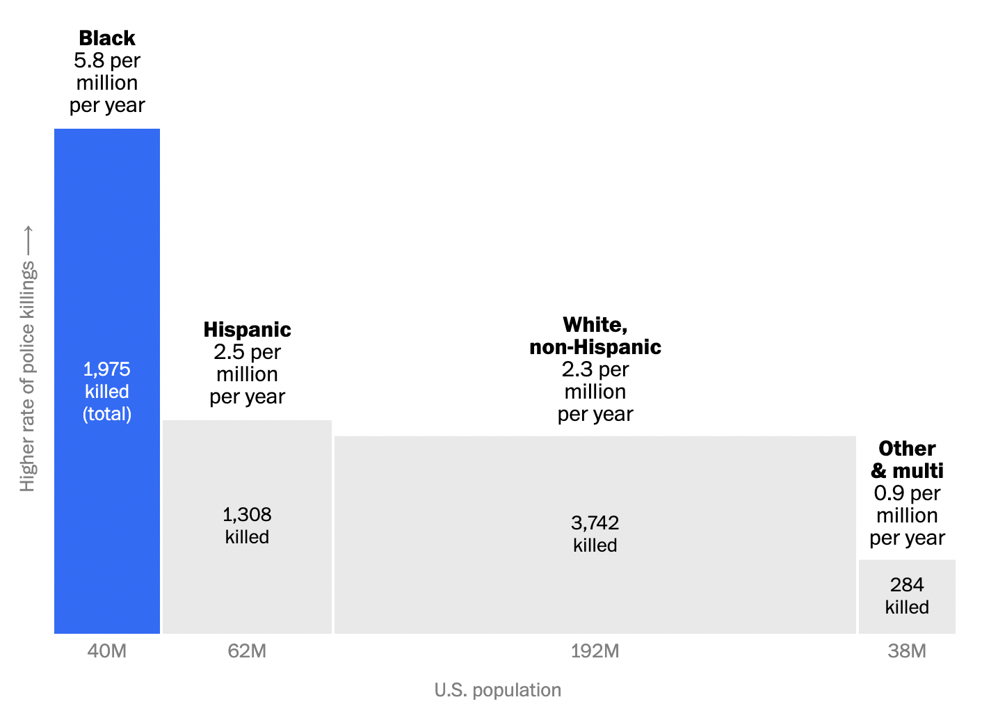 Black people account for roughly 14 percent of the U.S. population and are killed by police at more than twice the rate of White Americans. Hispanic Americans are also killed by police at a disproportionate rate.