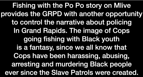 We don’t know what order Chief Winstrom said the things that he said, especially since we know how much the news media often constructs story narratives. In Winstrom’s comments he begins and ends with making the point about how important it is to make connections with the public. His comment, “Having adults in Grand Rapids that still embrace us and say, ‘Hey, we know that the police department is important and we want to support them,’ and making these connections for us is huge.” Winstrom is correct in saying that this is huge, because they want to influence how the public sees them and what better opportunity than to go fishing with adults and kids. In this setting, the GRPD can construct their own image, an image which is radically different than cops patrolling in neighborhoods, profiling Black motorists, or pulling guns on Black and Latinx youth, as has been the norm in recent years in Grand Rapids.